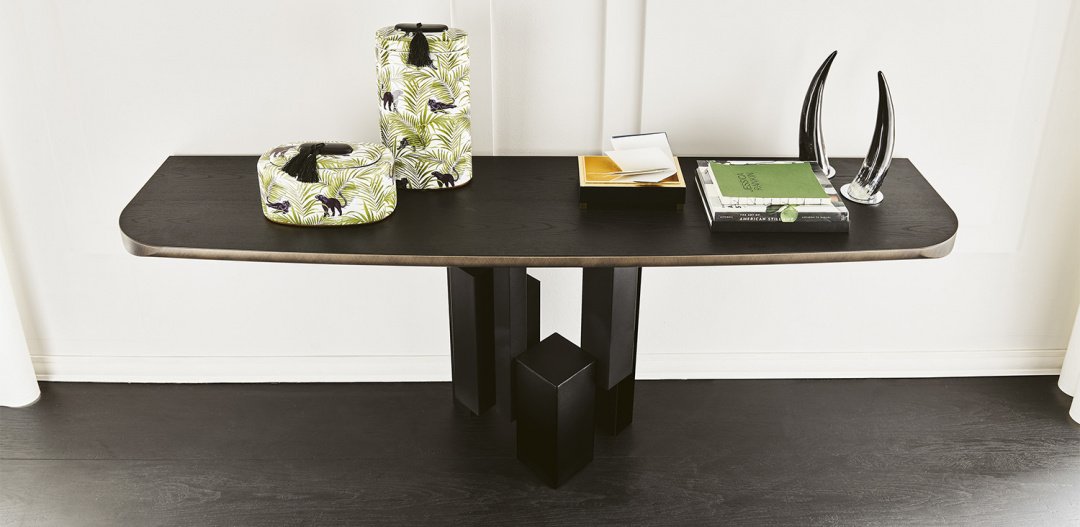 Консоль с базой из стали окрашенной в гофрированный титан (GFM11), графит (GFM69) или черный (GFM73). Топ из ореха Canaletto (NC) c нижним закругленным профилем окрашенным в черный или топ из вяза с открытыми порами, окрашенного в черный (OLM73) c профилем в брашированной бронзе. Обязателен крепеж в стену.