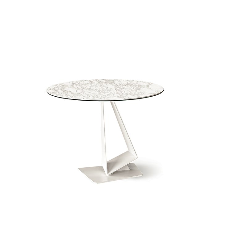 Стол с базой из стали окрашенной в гофрированный белый (GFM71) или графитовый (GFM69) цвет. Топ из керамики под мрамор, цветов: Calacatta (KM01), Alabastro (KM02) или Ardesia (KM04).