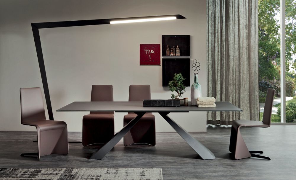 Стол с базой из стали, окрашенной в гофрированный титан (GFM11), белый (GFM71), черный (GFM73) или графитовый (GFM69)цвет или из сатинированной нержавеющей стали. Топ из сверхпрозрачного стекла толщиной 12 мм, окрашенного в графит, или из сверхпрозрачного травленого стекла, окрашенного в графит, в белом мраморе Carrara (BC) или Emperador (EMP). В версии 240х120 толщина топа - 15 мм.
