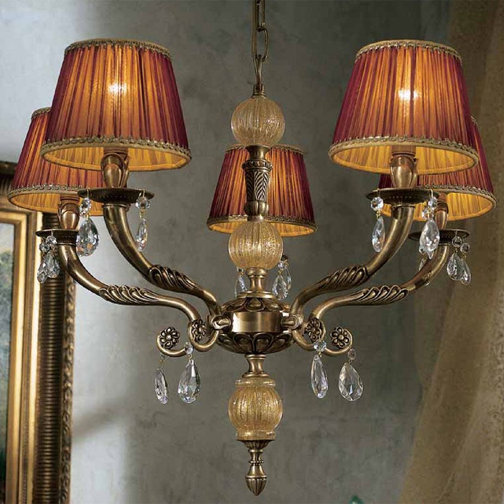 Цвет основания: полированная латунь. Декор: шары муранского стекла. Абажуры: янтарные тканевые. Подвесы: хрусталь Swarovski
