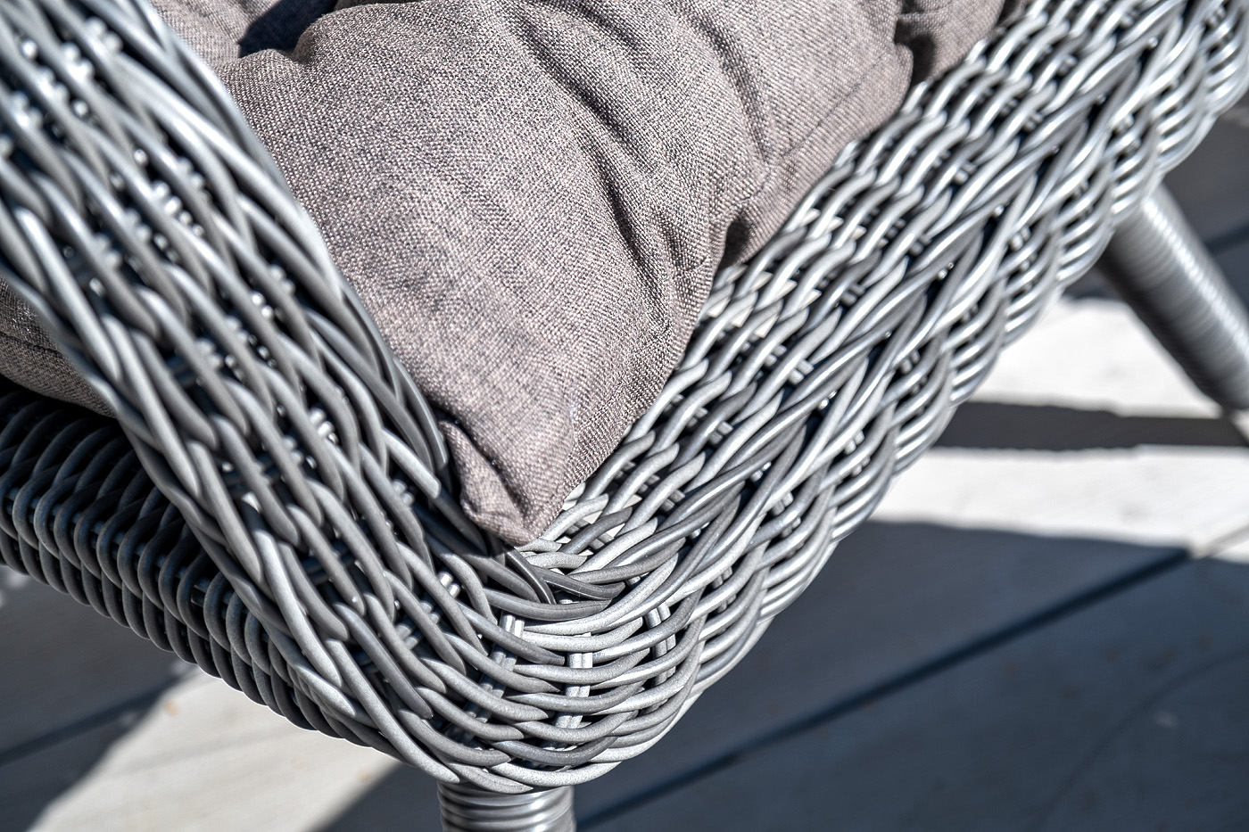 Садовое кресло дополнено мягкими подушками для комфортного размещения. Они выполнены в серо-коричневом цвете. При их пошиве используется полиэстер с плотностью 230гр/м2. Влагоотталкивающая пропитка усиливает защитные свойства материала.