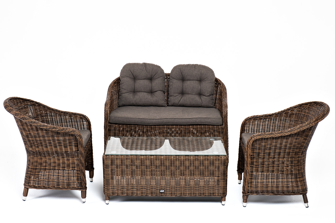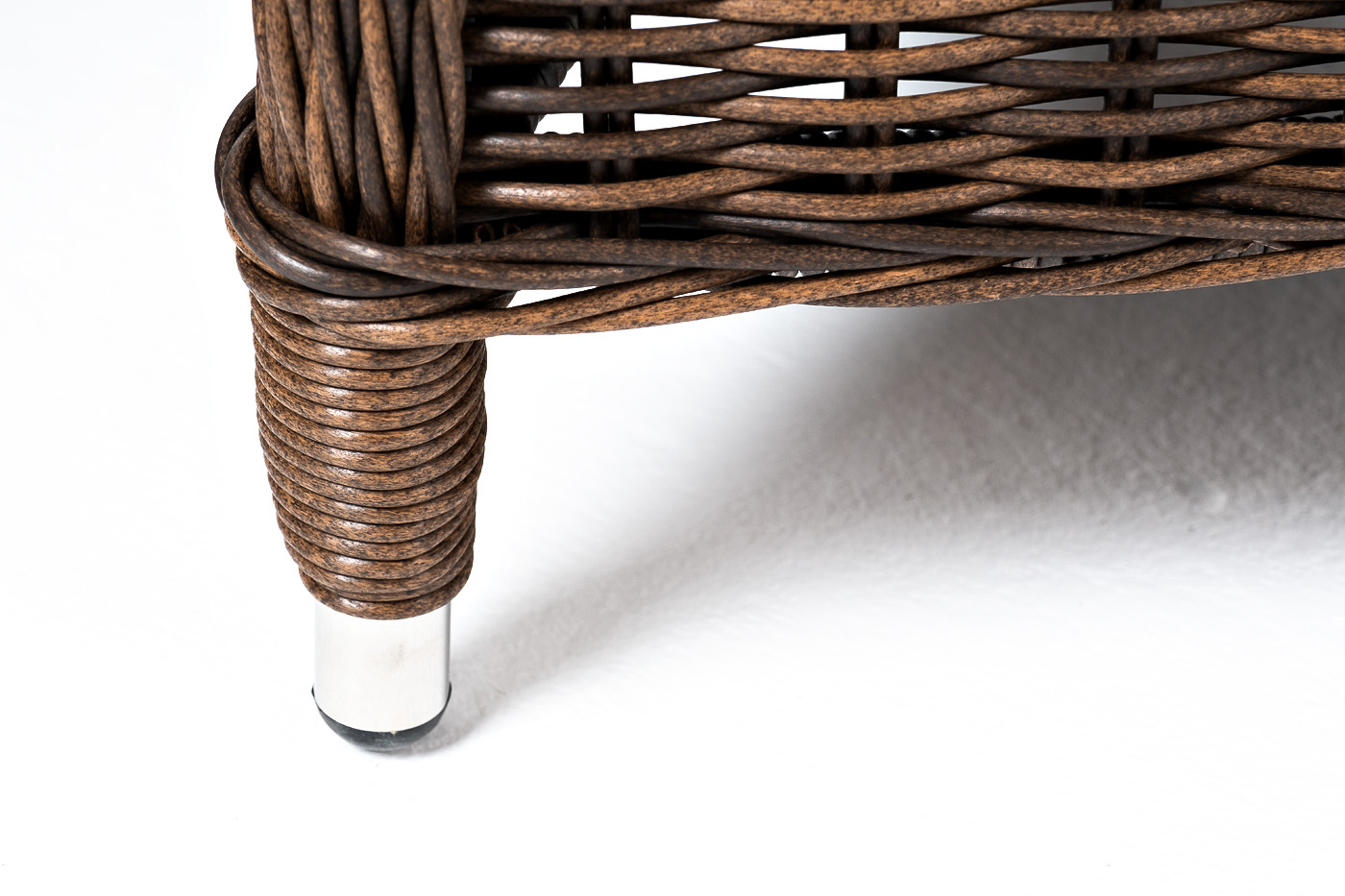 Комплект выполнен из круглого искусственного ротанга коричневого цвета. Каркас - из легкого и прочного алюминия. Подушки со съемными чехлами - из 100% полиэстера, плотностью 230гр/м2 с влагоотталкивающей пропиткой.