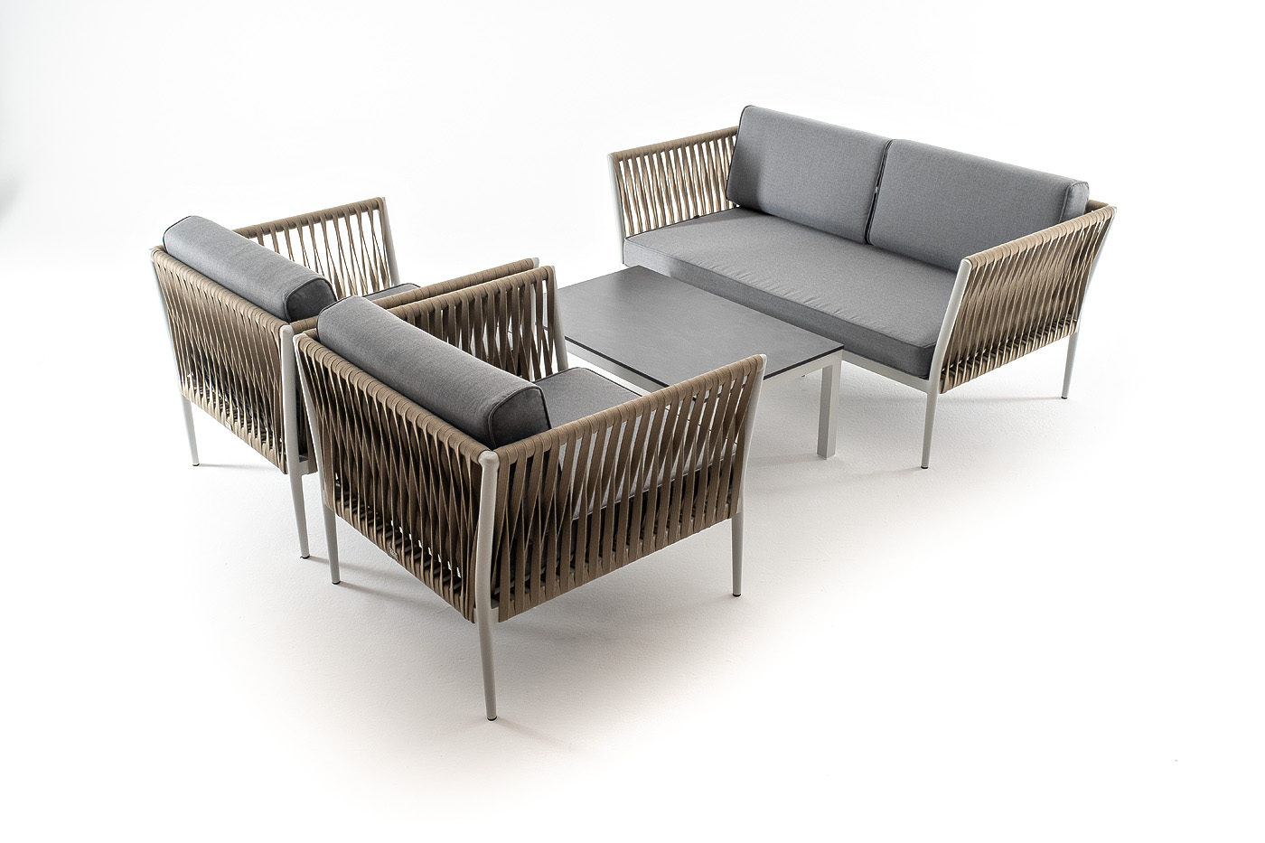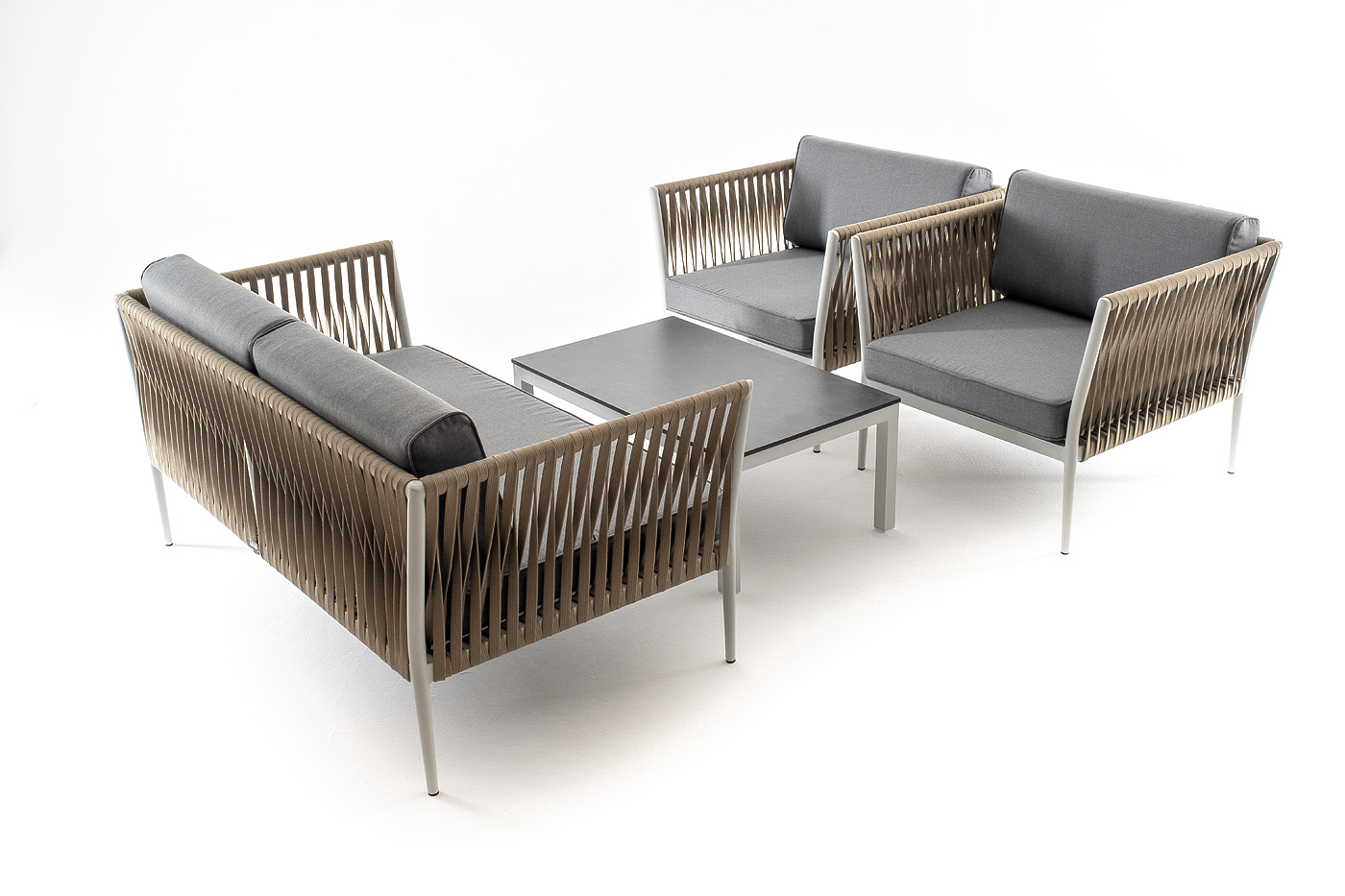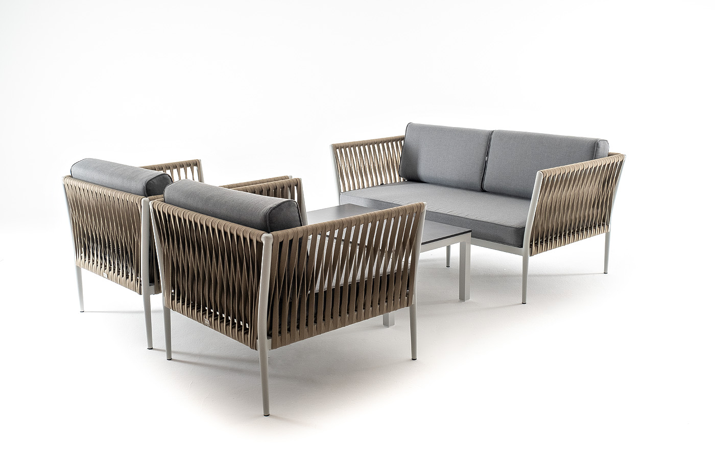 Диван и кресла изготовлены их алюминиевого прочного каркаса, оплетенного ручным способом роупом серо-коричневого цвета. Это эластичные ленты из полиэфирных волокон высокого качества.